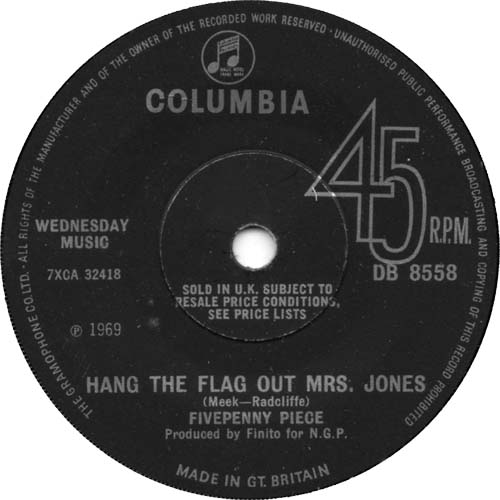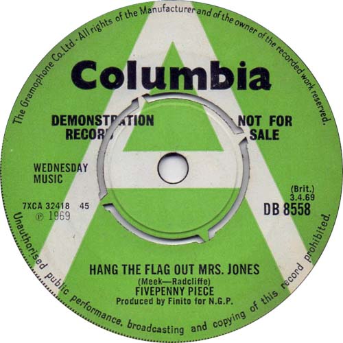Release Date: 3rd April 1969 The band’s second single – again on EMI’s Columbia label – was more pop oriented offering than its predecessor. Hang The Flag Out Mrs. Jones is believed to have been the song that the band sang on the TV show New Faces. It was certainly a commercial sounding single which by rights should have been a chart hit, especially with all the TV publicity. Inexplicably, it wasn’t. Hang The Flag Out Mrs. Jones is a strong pop song with a catchy tune and a bright, brass-led arrangement. Little Boy Little Girl is perhaps less distinguished but has a pleasant tune and a more folky arrangement. Neither track on the single ever appeared on any Fivepenny Piece album, making this single – like their first – very sought after by collectors. Side 1