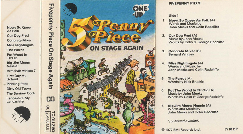 53 minutes The group's second live album saw them return in triumph to the Broadoak Hotel. The group positively flourishes in a live setting and it is clear that the Broadoak audience are loving every minute. Among the covers are Jake Thackery's 'Bantam Cock' (a moment for George to shine), future group member Bernard Wrigley's 'Our Bill and the Concrete Mixer' whilst a cover of Ewan McColl's 'Dirty Old Town' reminds us that when it comes to folk music, Fivepenny remain second to none. Among the Meeks and Radcliffe offerings is 'Big Jim Meets Nessie', an update on events with our favourite giant worm. 'Lancashire My Lancashire' finishes off the recording in what could be seen as a national anthem for the county, but strangely misses the mark a little. Producer: FIVEPENNY PIECE Drums: Phil Barlow Recording supervision: Peter Tattersall