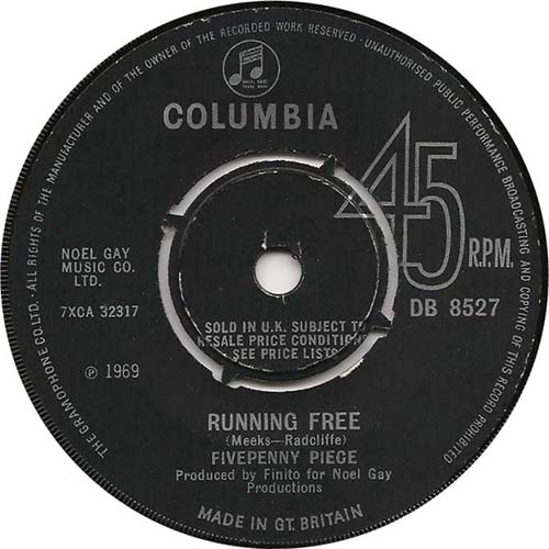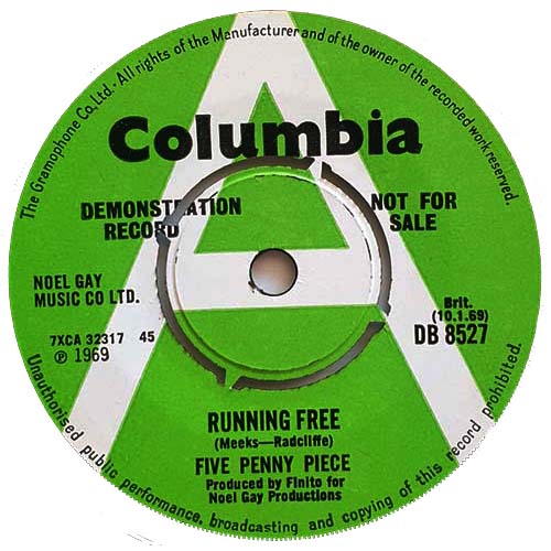 Release Date: 10th January 1969 This was the debut release by the band, issued early in 1969. The record labels on both sides of the single state that the record was produced by ‘Finito’ – a management company run by Tony Palmer and Adrian Rudge – for Noel Gay Productions.Sadly, the record didn’t, as they say, trouble the compilers of the record charts. Neither side of this single appeared on any of the band’s albums and consequently the record has become highly collectible. Both songs were written by John Meeks and Colin Radcliffe, who wrote much of the material on their later records. Both sides of the record sound more “folky” than some of the band’s later work, even though there is orchestral string accompaniment to the band’s otherwise mainly acoustic guitar-based sound, with George on string bass. A minor but interesting point to note is that on the demo label the band was shown as Five Penny Piece (“Five Penny” as two separate words), whereas on the official release copy it was shown as Fivepenny Piece (“Fivepenny” as one word) – you can see this on the labels displayed at the top of the page. Side 1