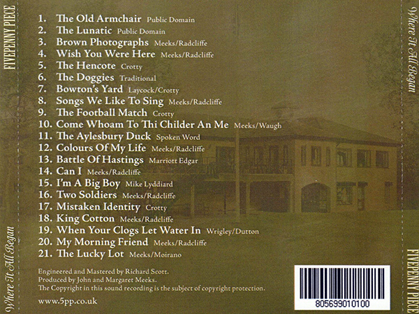 This CD features a live recording from the Ashton Under Lyne Golf Club, the place where it all began for Fivepenny Piece. The concert reunited Lynda Meeks, John Meeks and Eddie Crotty performing a selection of old favourites and new material. They are joined by John's grandson Matthew for some cheeky interludes. It is a nostalgic and heart warming farewell to the original group with a very special performance captured for posterity.